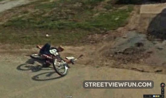 You can see a kid on a bike ahead in front of the red truck. Move up ahead on the road in street view and watch the guy wipe out and stare at the google car as it goes by (thanks Aaron).