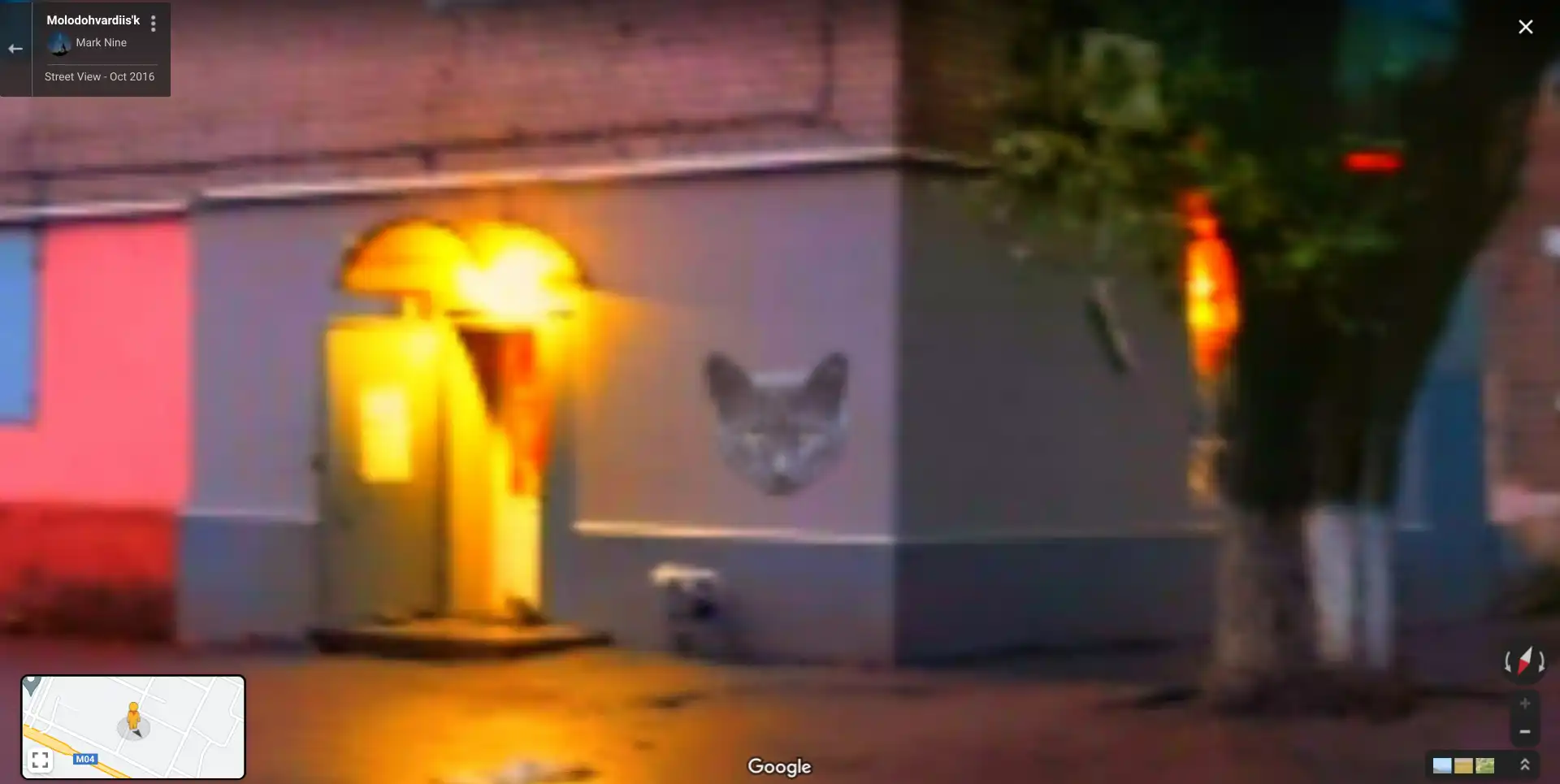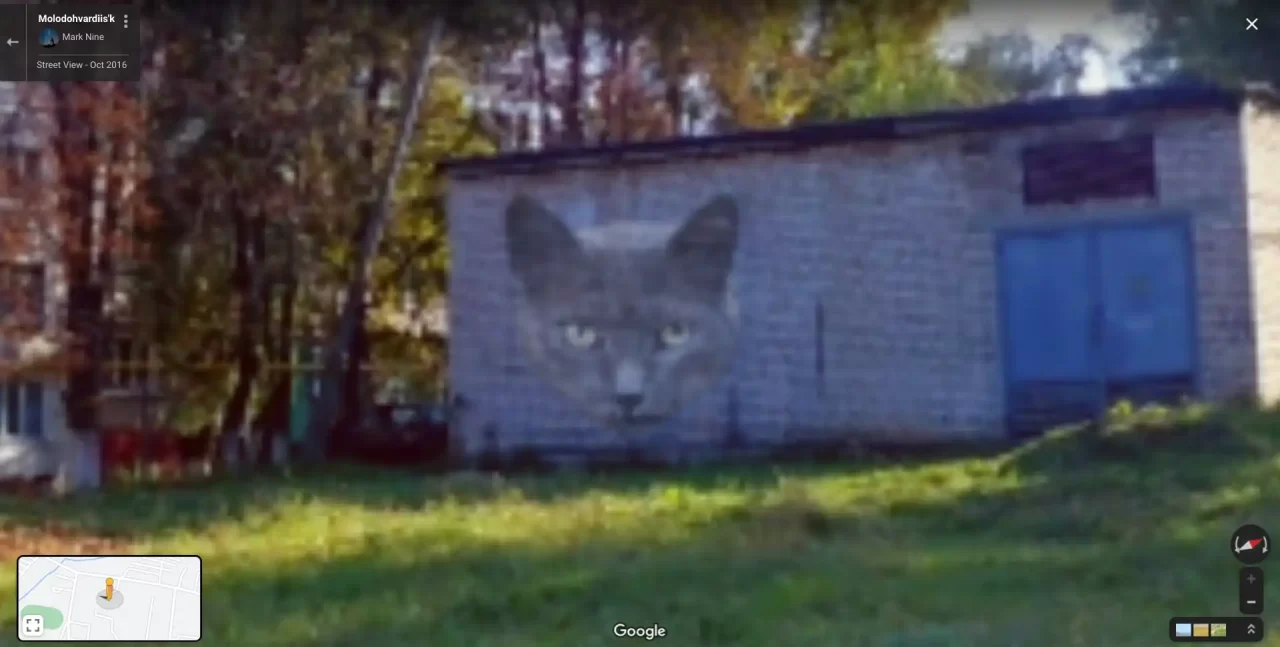 Cheshire Cat Art Photo Sphere Ukraine February 21, 2022February 21, 2022 by sashafromdonetsk sashafromdonetsk · Reply Larger Larger Please wait... Similar Street View images The legendary two-legged cat (real) Is that a cat? Cat Building A tree or a big cat’s face?