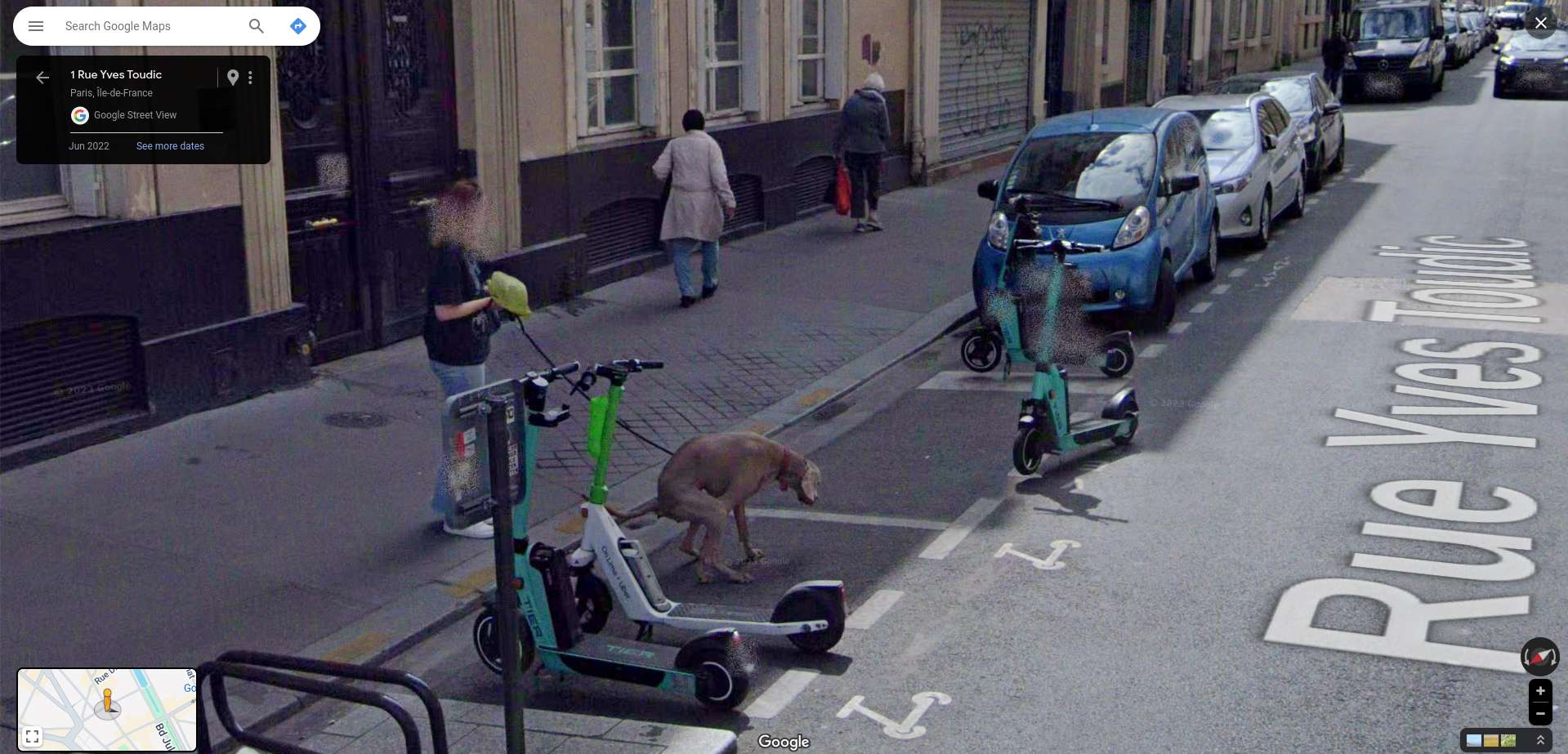 Google guy with three legs, tourist with his dog looking at the Google car, a security guard looking at the Google Trekker and the Google vehicle turned on ready to leave