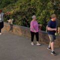 Three dogs walking on a brickwall