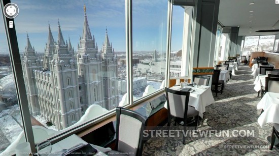 Welcome inside the Roof Restaurant in Salt Lake City. The restaurant is looking over the Salt Lake Temple, which is owned by the Church of Jesus Christ of Latter-day Saints (mormon). Unfortunately you can’t go inside the temple on Street View.